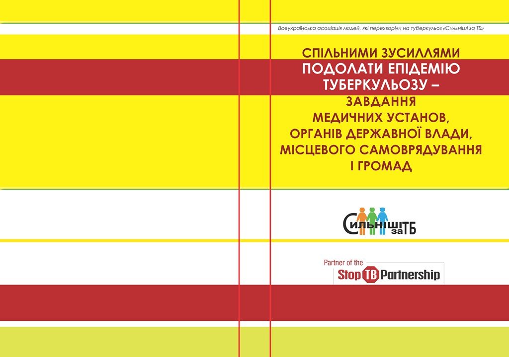 В рамках проекту Challenge Facility for Civil Society Round 8, мета якого полягає у покращенні доступу до послуг по боротьбі з туберкульозом та підвищенні якості послуг, що надаються пацієнтам, Всеукраїнською асоціацією людей, які перехворіли на туберкульоз «Сильнiшi за ТБ» підготовлено буклет «Спільними зусиллями подолати епідемію туберкульозу – завдання медичних установ, органів державної влади, місцевого самоврядування і громад».